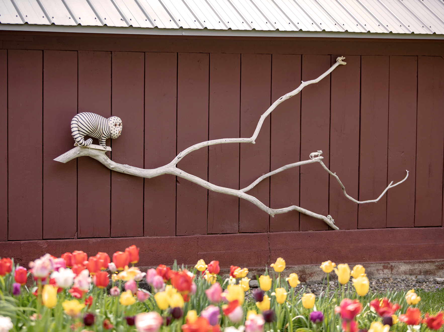 Project Art has a barn cat! Sergei has made numerous ceramic forms that are made to perch on fallen branches from the Project Art grounds. Having done multiple smaller branch installations in our Gallery, Sergei chose our red barn for his most recent installation. Find the cat guarding our parking pad at Project Art, visible from Main Street.